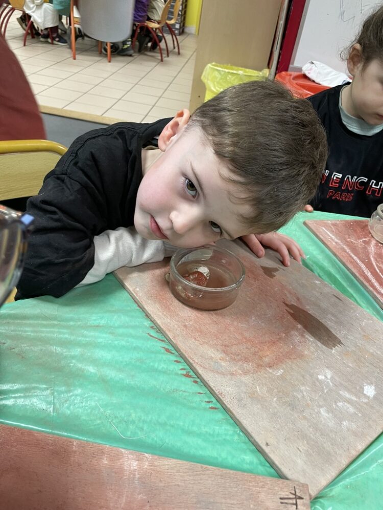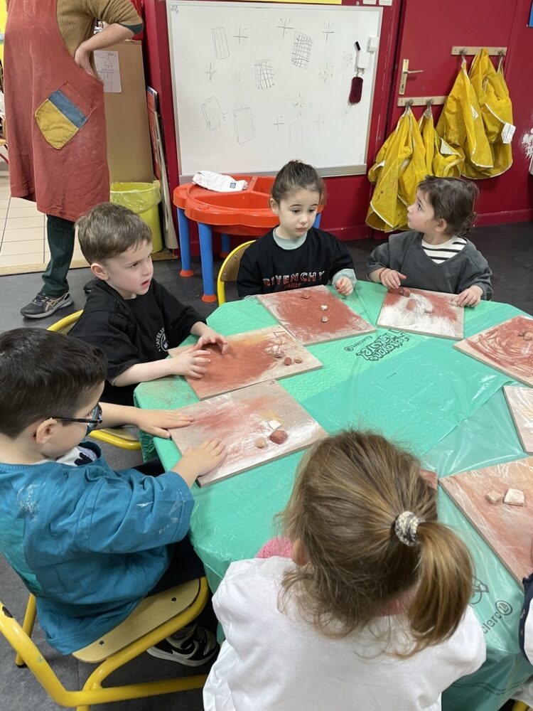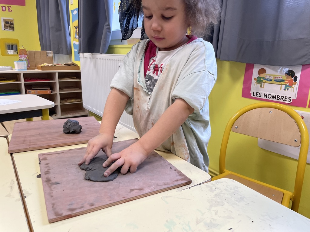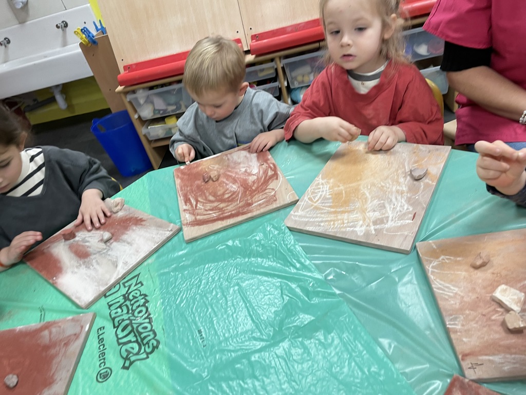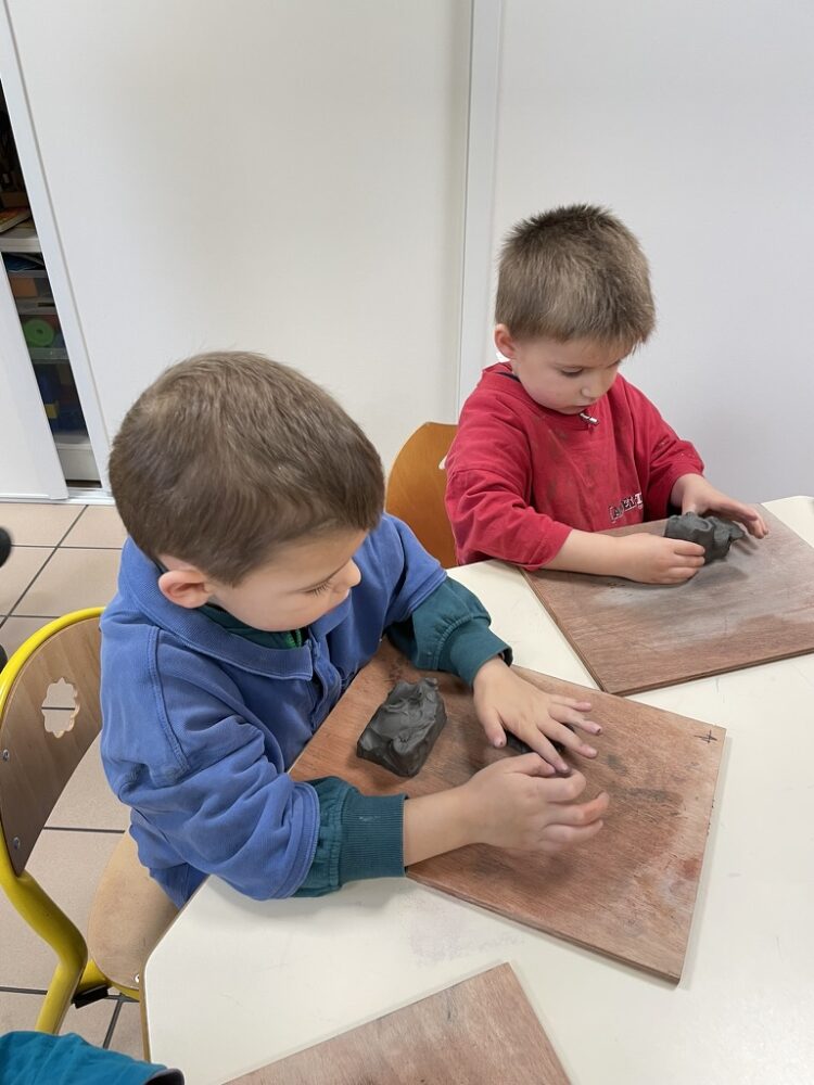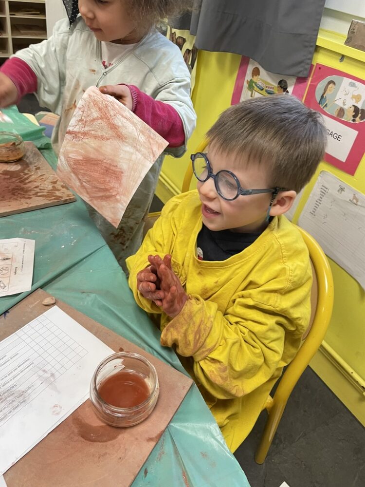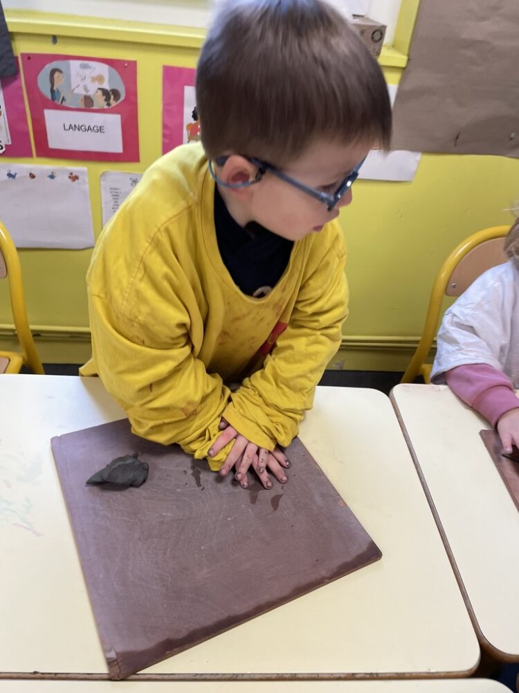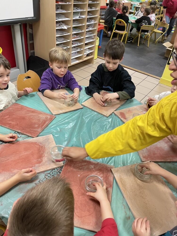 Mardi 13 janvier, Laure-Elise, de l’atelier de la Marouette, est venue dans notre classe pour un atelier terre. Au cours de cette séance, nous avons découvert différents états de la terre : sèche comme des cailloux, en poussière, humide, blanche, grise, un peu rouge. Nous avons découvert les propriétés de la Terre avec nos différents sens : la vue, le toucher, l’ouïe (quand on verse de l’eau sur la terre sèche, elle fait un petit bruit), l’odorat, et même le goût. Nous avons fait des petites expériences comme poser notre langue sur la terre et s’apercevoir qu’elle colle dessus! Nous l’avons modelée, fait des colombins, des galettes, des empreintes avec des objets. Une première séance de découverte et d’exploration qui a beaucoup plu