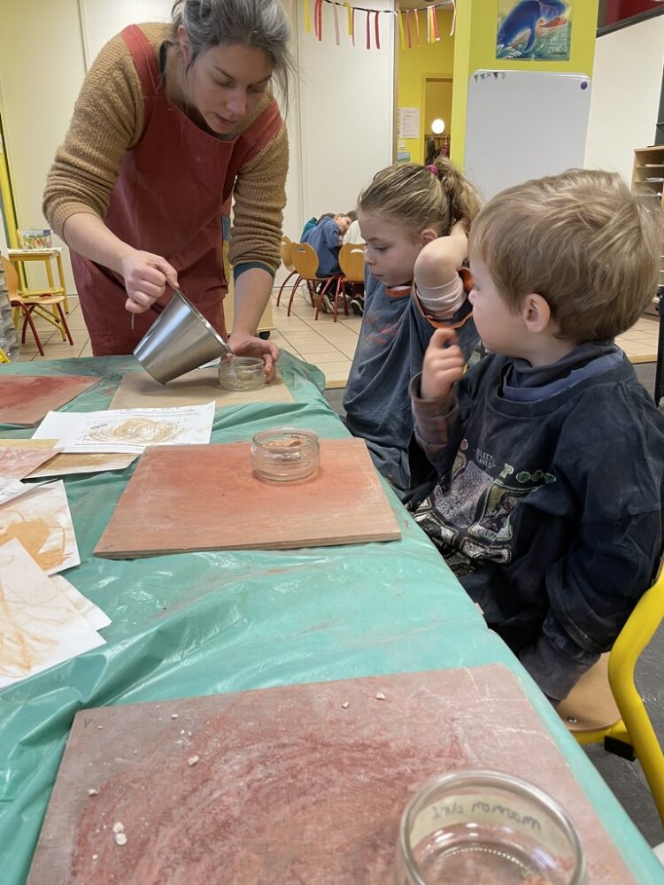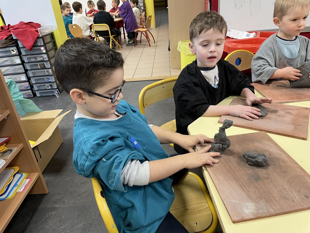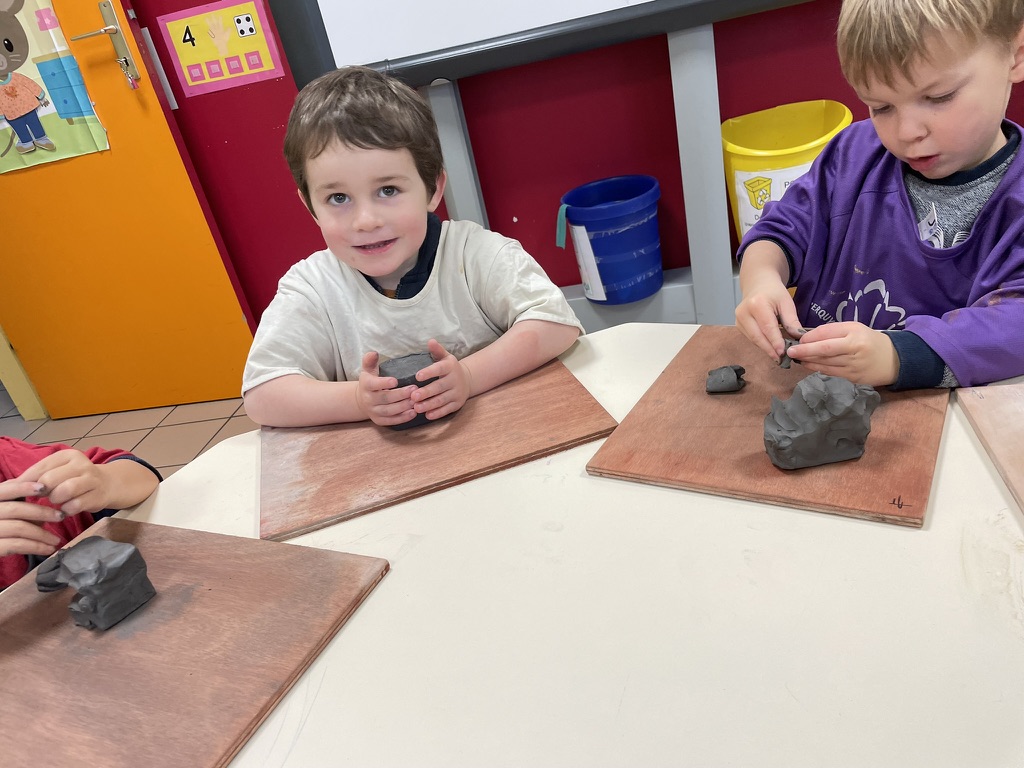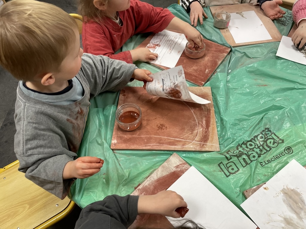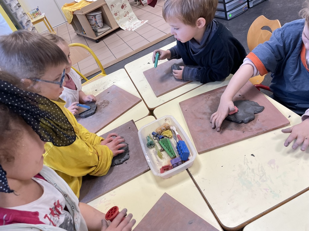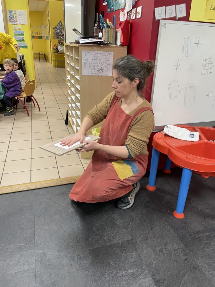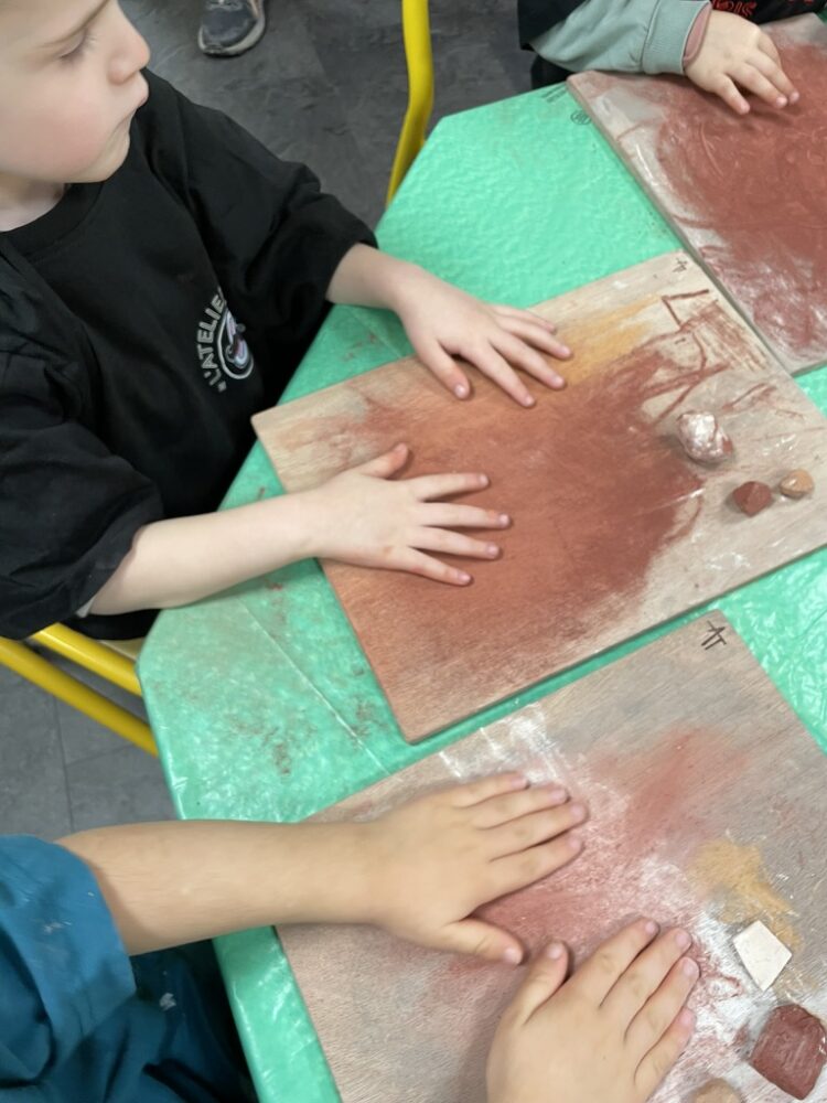 Mardi 13 janvier, Laure-Elise, de l’atelier de la Marouette, est venue dans notre classe pour un atelier terre. Au cours de cette séance, nous avons découvert différents états de la terre : sèche comme des cailloux, en poussière, humide, blanche, grise, un peu rouge. Nous avons découvert les propriétés de la Terre avec nos différents sens : la vue, le toucher, l’ouïe (quand on verse de l’eau sur la terre sèche, elle fait un petit bruit), l’odorat, et même le goût. Nous avons fait des petites expériences comme poser notre langue sur la terre et s’apercevoir qu’elle colle dessus! Nous l’avons modelée, fait des colombins, des galettes, des empreintes avec des objets. Une première séance de découverte et d’exploration qui a beaucoup plu