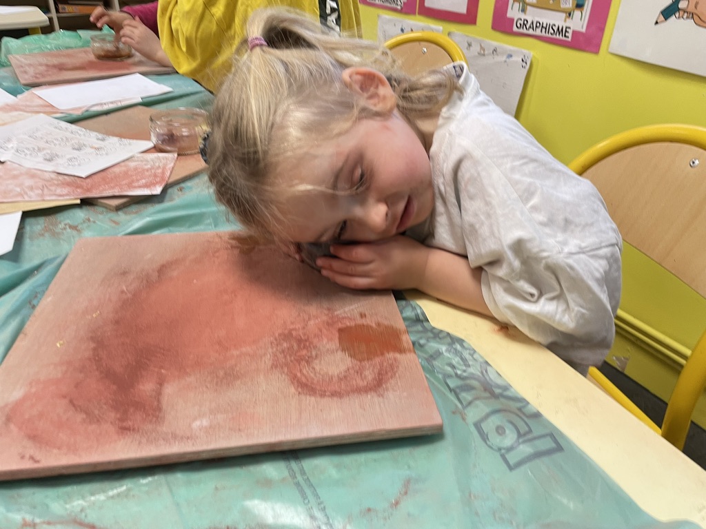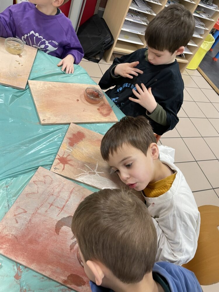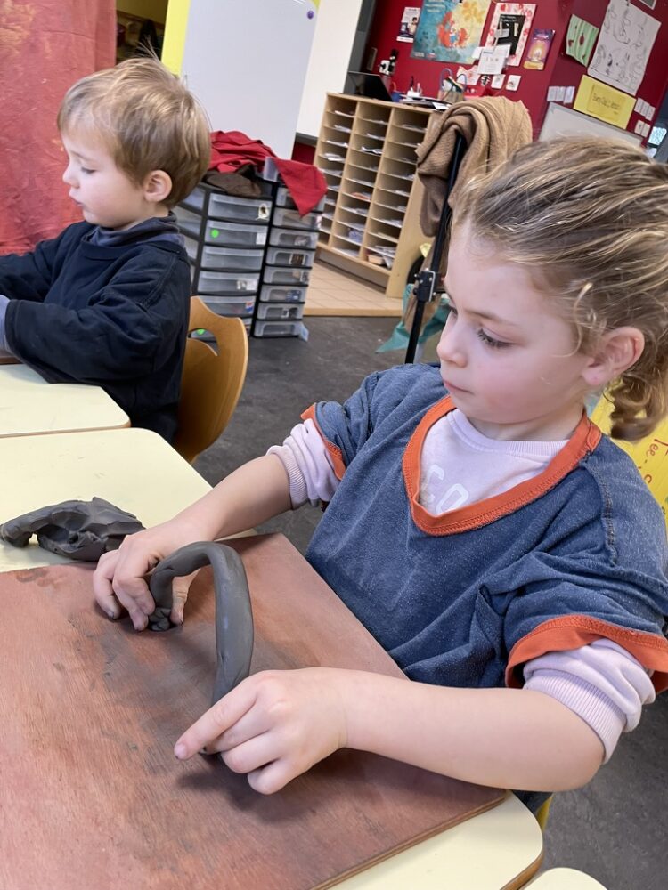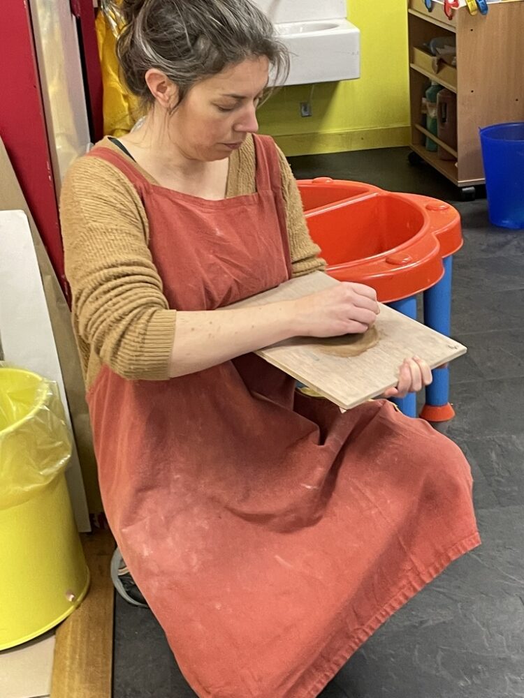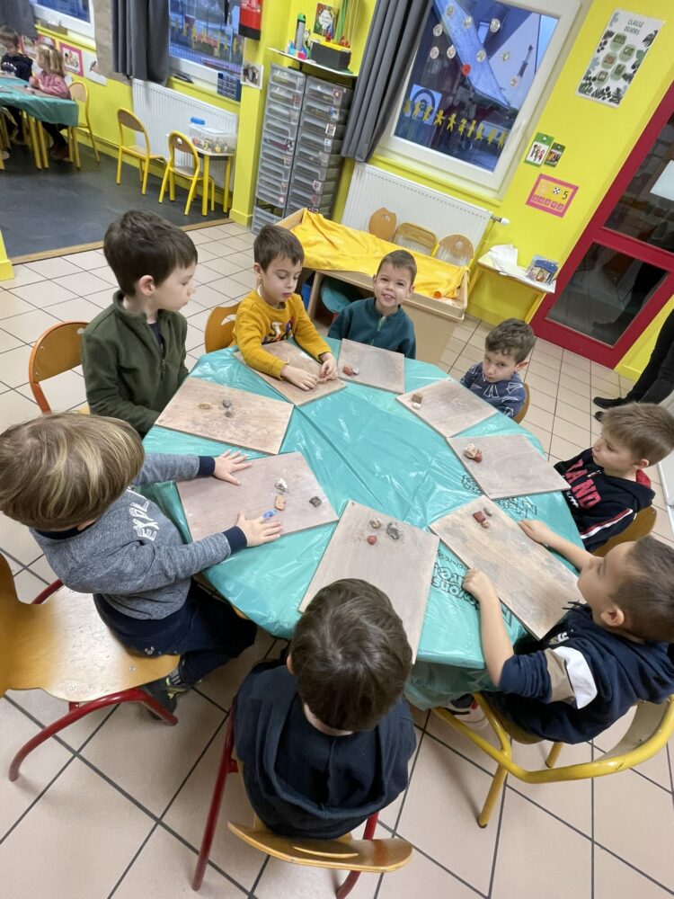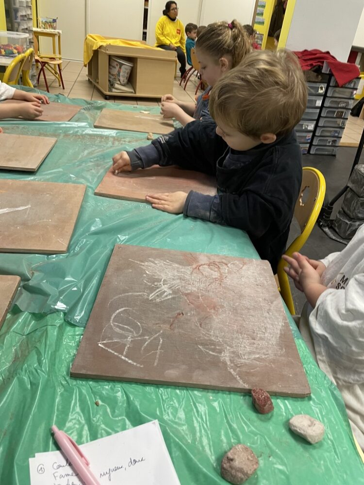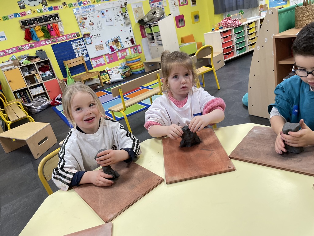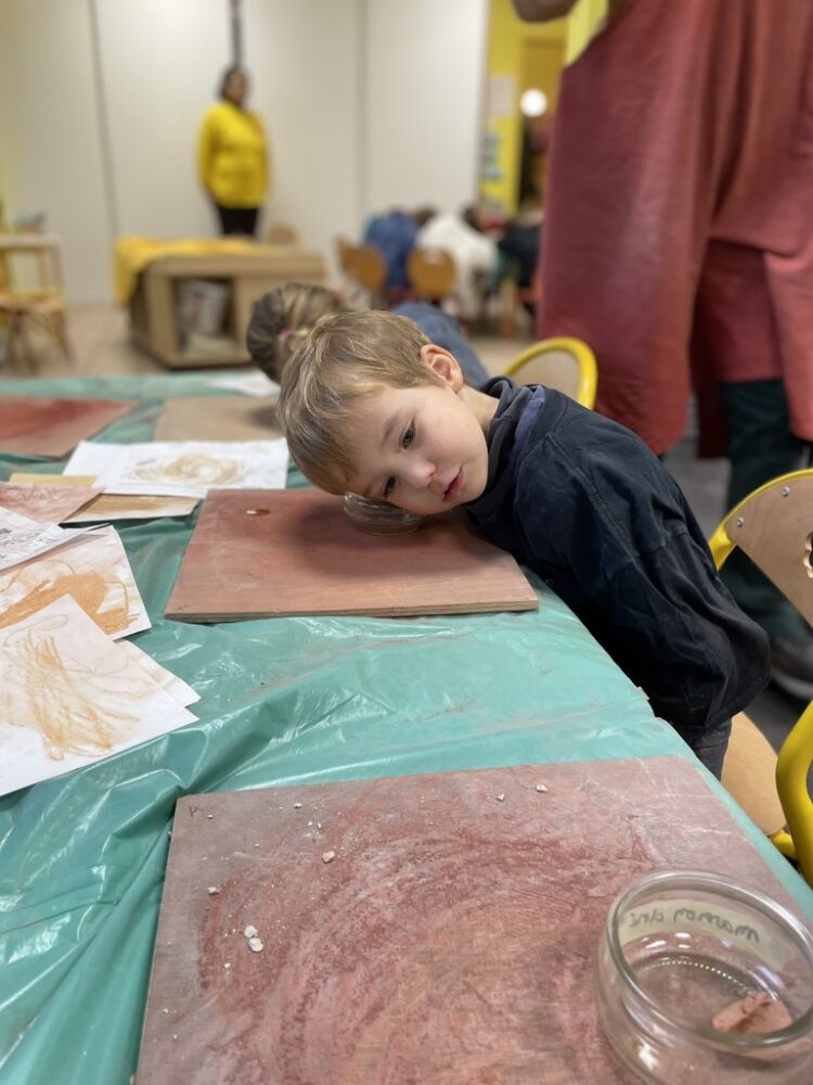 Mardi 13 janvier, Laure-Elise, de l’atelier de la Marouette, est venue dans notre classe pour un atelier terre. Au cours de cette séance, nous avons découvert différents états de la terre : sèche comme des cailloux, en poussière, humide, blanche, grise, un peu rouge. Nous avons découvert les propriétés de la Terre avec nos différents sens : la vue, le toucher, l’ouïe (quand on verse de l’eau sur la terre sèche, elle fait un petit bruit), l’odorat, et même le goût. Nous avons fait des petites expériences comme poser notre langue sur la terre et s’apercevoir qu’elle colle dessus! Nous l’avons modelée, fait des colombins, des galettes, des empreintes avec des objets. Une première séance de découverte et d’exploration qui a beaucoup plu