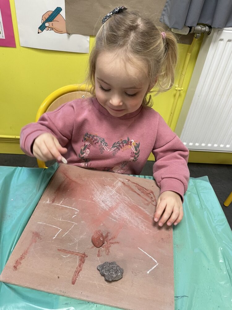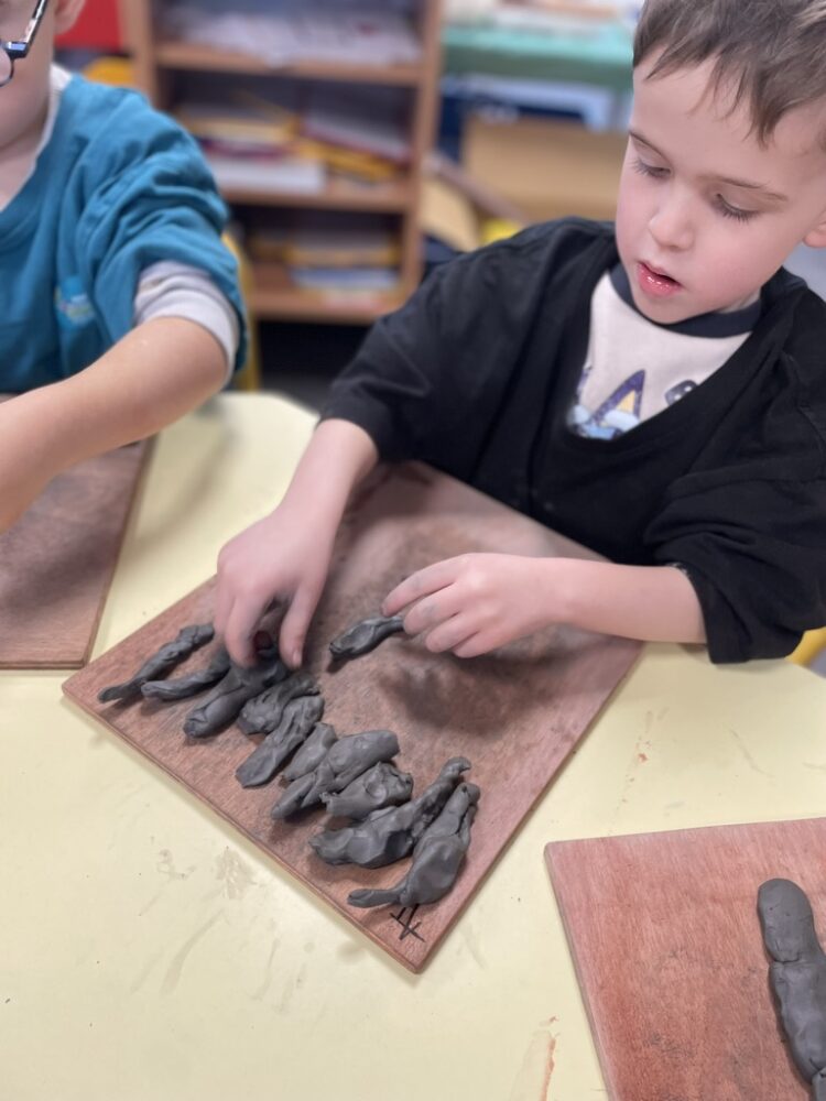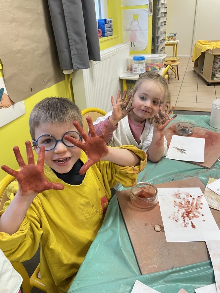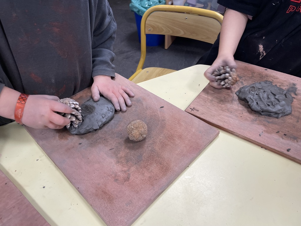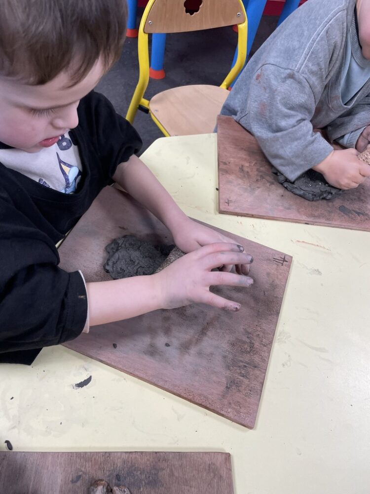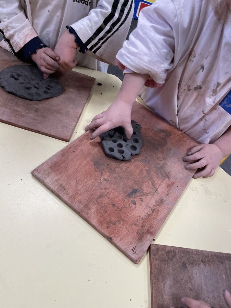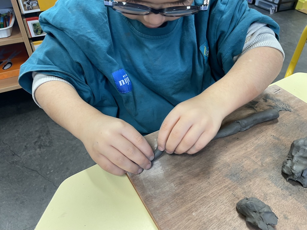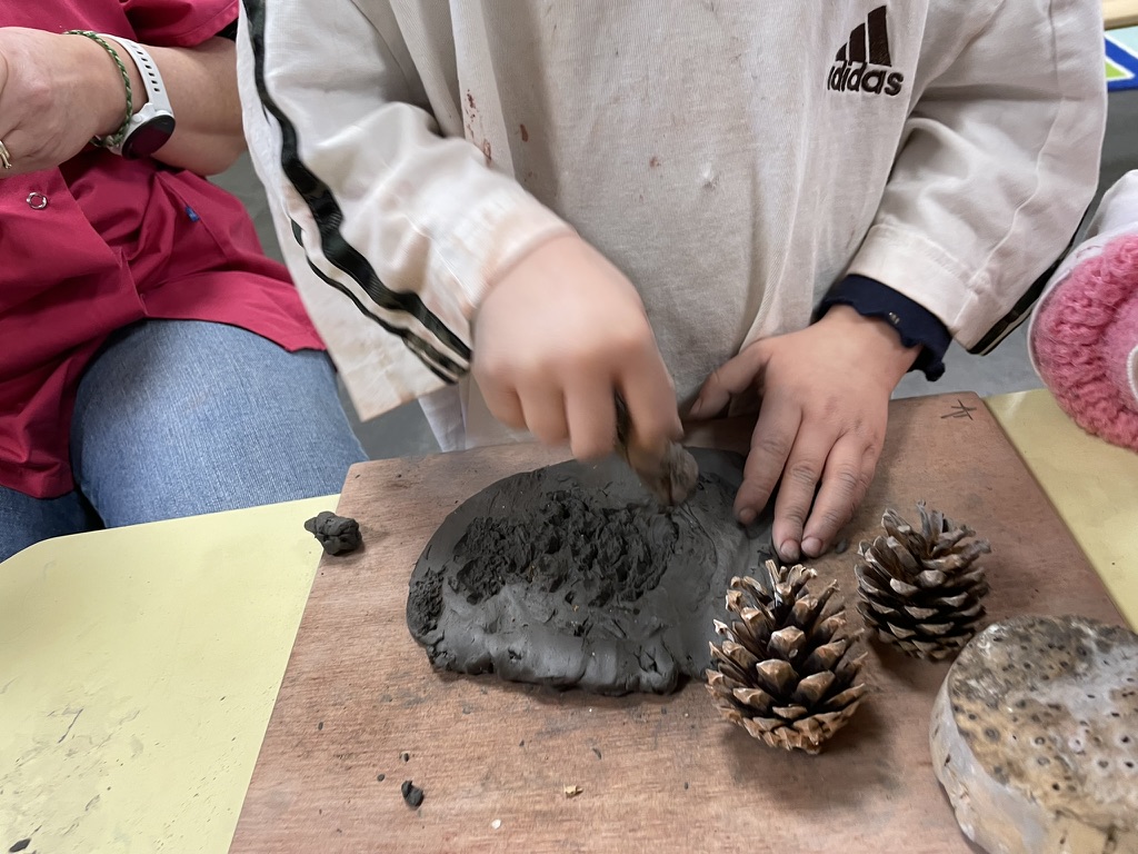 Mardi 13 janvier, Laure-Elise, de l’atelier de la Marouette, est venue dans notre classe pour un atelier terre. Au cours de cette séance, nous avons découvert différents états de la terre : sèche comme des cailloux, en poussière, humide, blanche, grise, un peu rouge. Nous avons découvert les propriétés de la Terre avec nos différents sens : la vue, le toucher, l’ouïe (quand on verse de l’eau sur la terre sèche, elle fait un petit bruit), l’odorat, et même le goût. Nous avons fait des petites expériences comme poser notre langue sur la terre et s’apercevoir qu’elle colle dessus! Nous l’avons modelée, fait des colombins, des galettes, des empreintes avec des objets. Une première séance de découverte et d’exploration qui a beaucoup plu