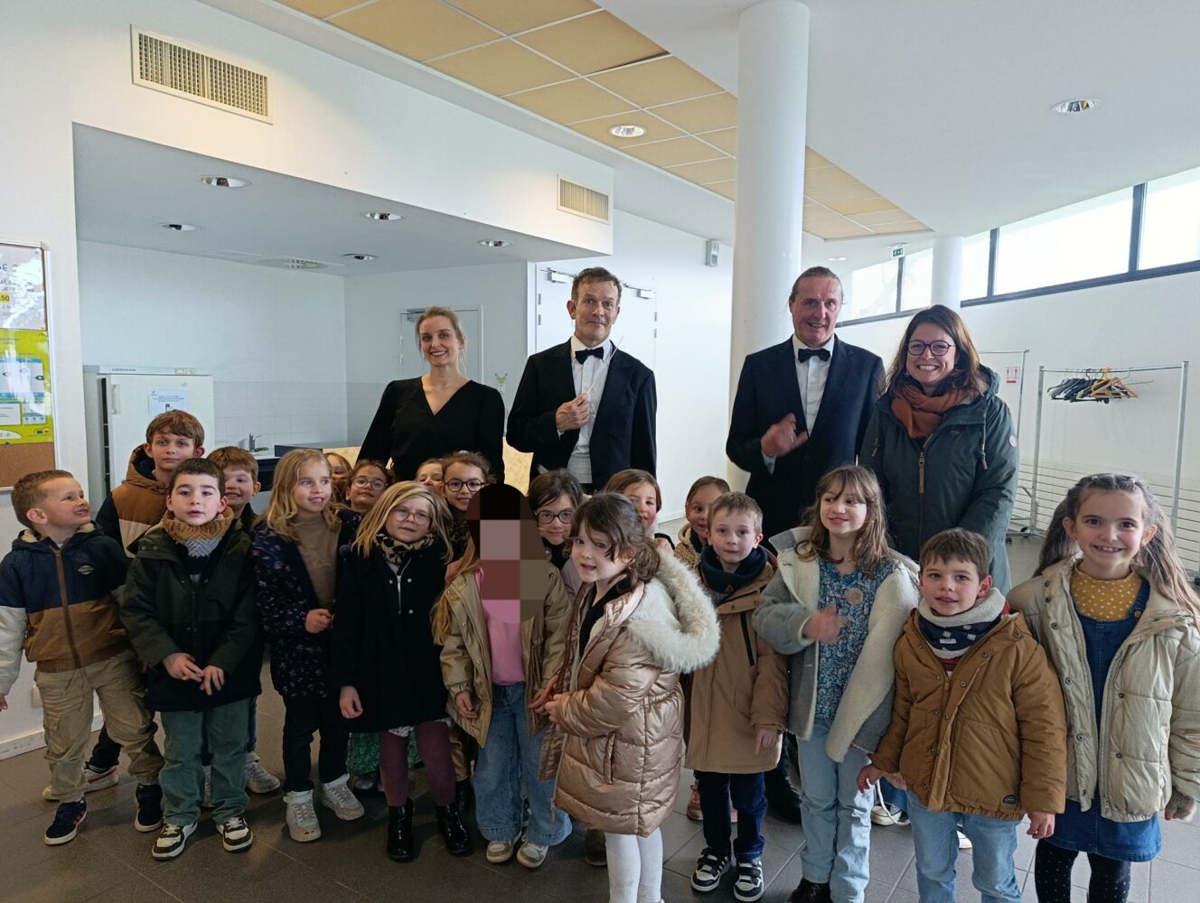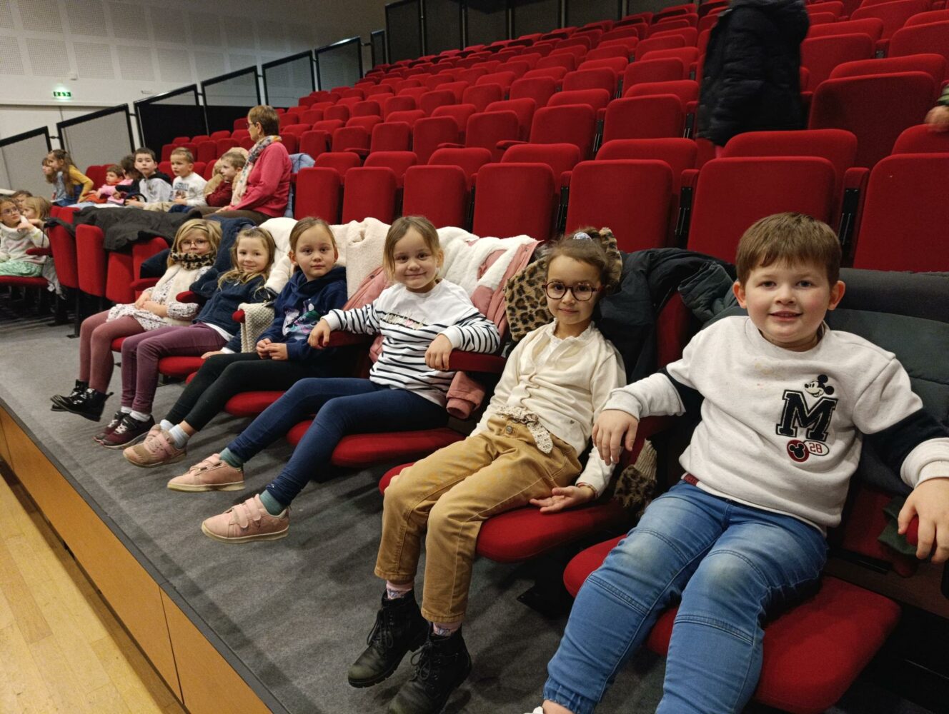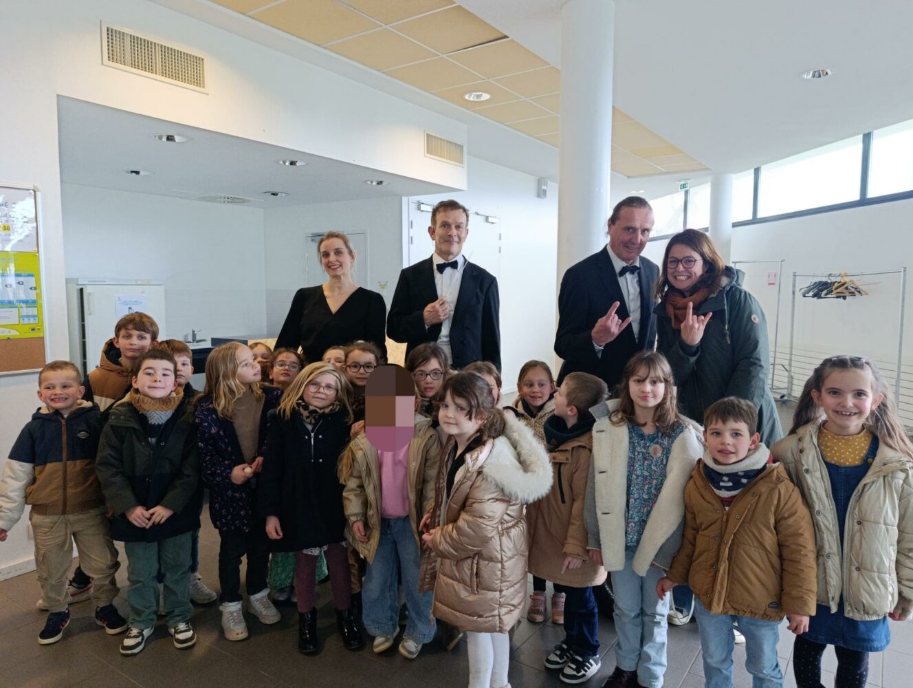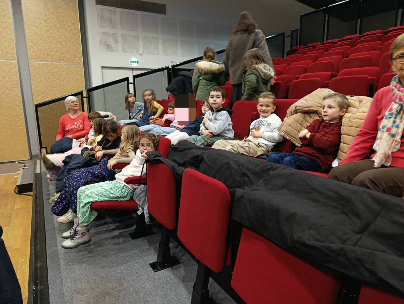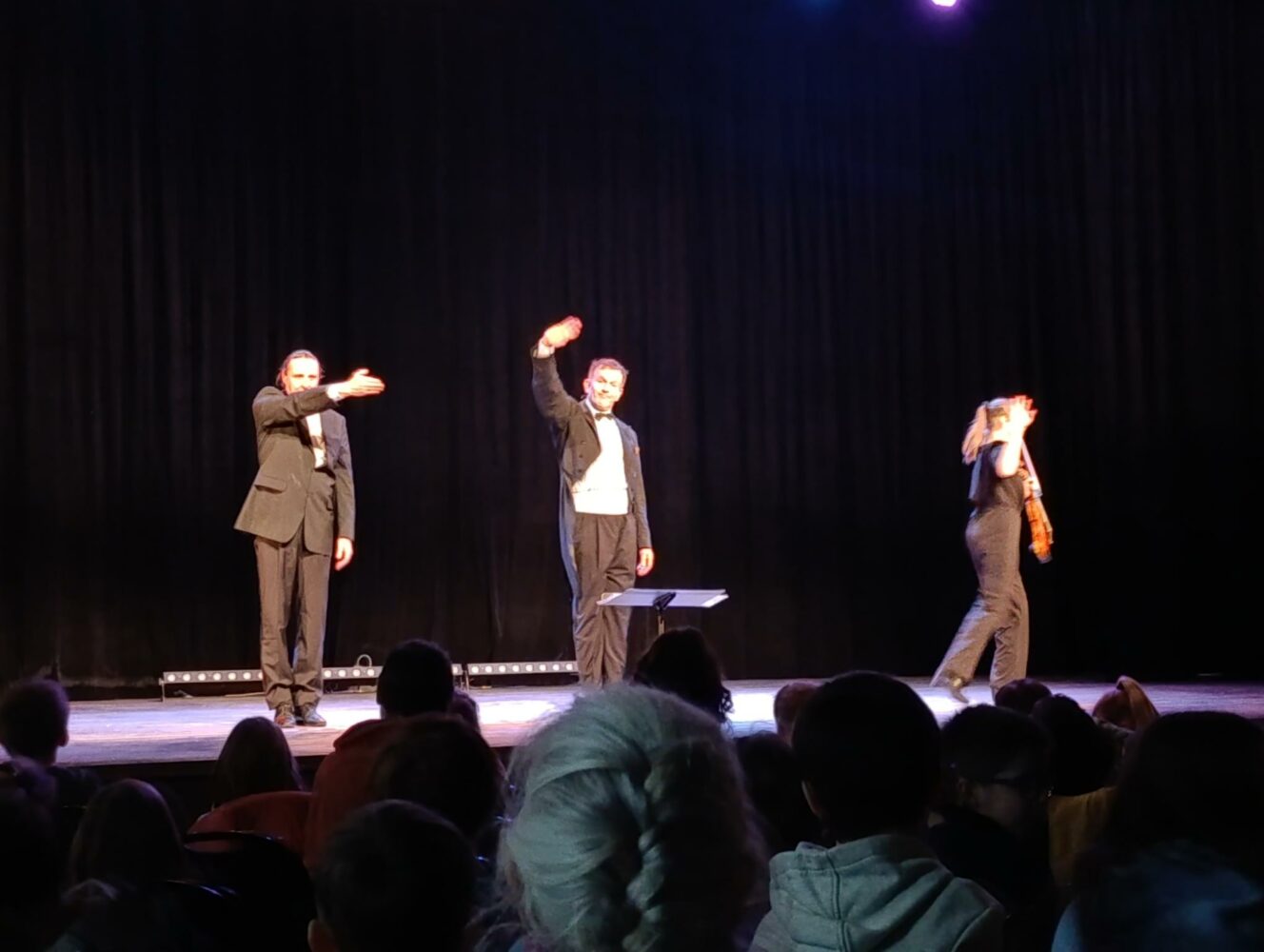 Vendredi 13 février, les élèves de GS et CP ont assisté au spectacle musical “Trois Quatre…” c’est ainsi que les chefs d’orchestre donnent souvent le départ aux musiciens. Sur scène, un chef d’orchestre multi-instrumentiste, et deux musiciens : un guitariste, et une violoniste et chanteuse lyrique. Nous avons pu profité d’un concert de « grande » musique, passant en revue différentes humeurs, qui nous ont bien fait rire.